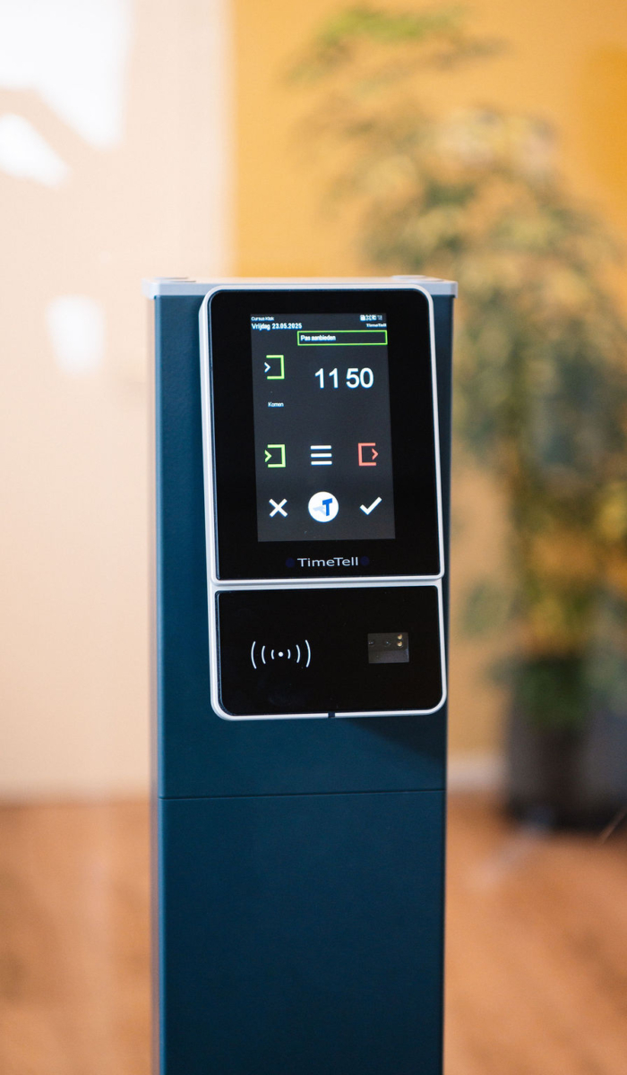 Het systeem maakt tijdregistratie nóg efficiënter. Kloktijden worden automatisch gekoppeld aan projecten en medewerkers, verlof en ziekte kunnen worden meegenomen, en via het receptiescherm zie je in één oogopslag wie aanwezig is. Combineer je het met de Timetell app, dan kunnen medewerkers ook buiten kantoor veilig in- en uitklokken met behulp van geofencing.